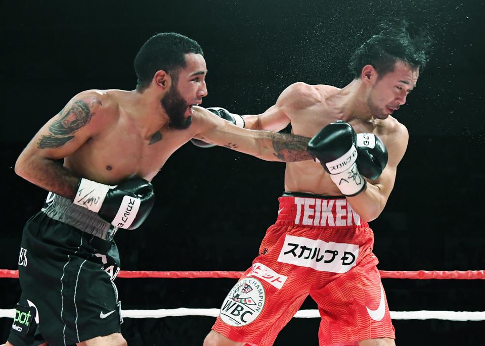 TOPSHOT - This photo taken on August 15, 2017 shows Mexican challenger Luis Nery (L) fighting against Japan's Shinsuke Yamanaka (R) during their WBC bantamweight title match at the Shimadzu Arena in Kyoto. Nery won with a fourth-round knockout. / AFP PHOTO / JIJI PRESS / STR / Japan OUT (Photo credit should read STR/AFP/Getty Images)